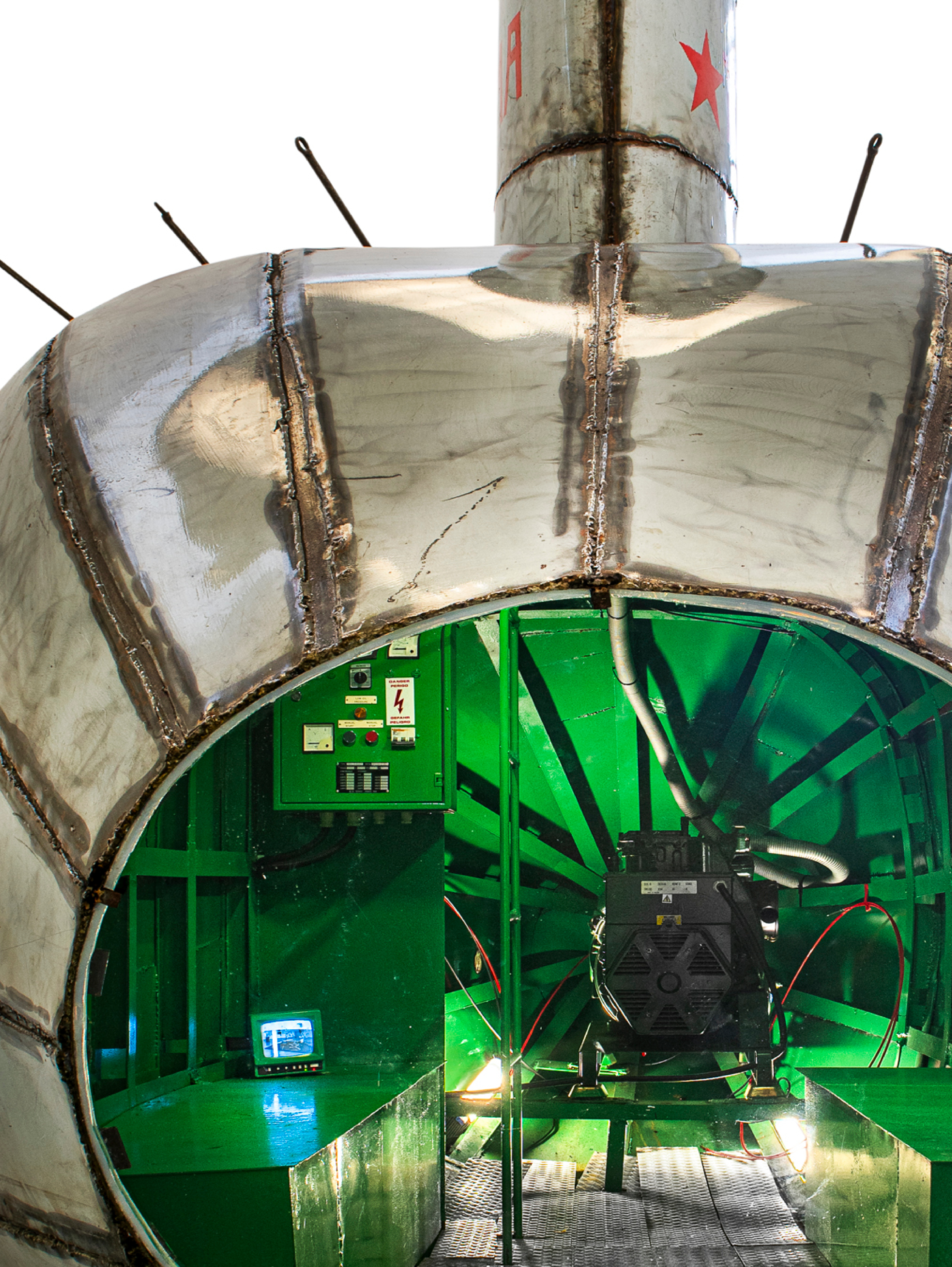 Materialen: staal, plexiglas, motor, generator, videocamera, monitor, schakelpaneel